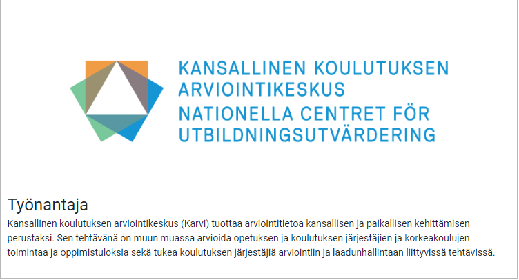 "Kansallisen koulutuksen arviointikeskus (Karvi) tuottaa arviointitietoa kansallisen ja paikallisen kehittämisen perustaksi. Sen tehtävänä on muun muassa arvioida opetuksen ja koulutuksen järjestäjien ja korkeakoulujen toimitaa ja oppimistuloksia sekä tukea koulutuksen järjestäjää arviointiin ja laadunvalvontaan liittyvissä tehtävissä." (kuvakaappaus: valtiolle.fi)