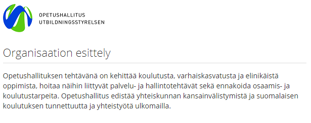 "Opetushallituksen tehtävänä on kehittää koulutusta, varhaiskasvatusta ja elinikäistä oppimista, hoitaa näihin liittyvät palvelu- ja hallintotehtävät sekä ennakoida osaamis- ja koulutustarpeita. Opetushallitus edistää yhteiskunnan kansainvälistymistä ja suomalaisen koulutuksen tunnettuutta ja yhteistyötä ulkomailla." (kuvakaappaus: valtiolle.fi)
