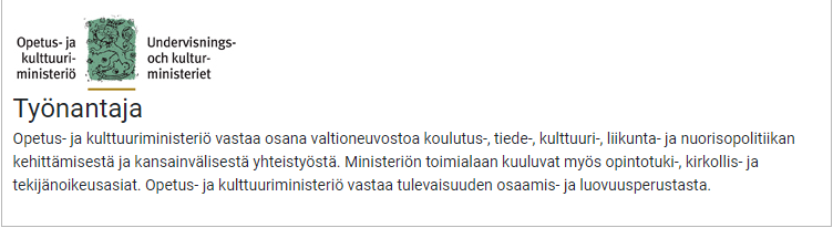 "Opetus- ja kulttuuriministeriö vastaa osana valtioneuvostoa koulutus-, tiede-, kulttuuri-, liikunta- ja nuorisopolitiikan kehittämisestä ja kansainvälisestä yhteistyöstä. Ministeriön toimialaan kuuluvat myös opintotuki-, kirkollis- ja tekijänoikeusasiat. Opetus- ja kulttuuriministeriö vastaa tulevaisuuden osaamis- ja luovuusperustasta"